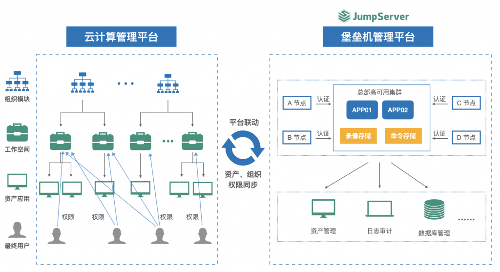 CloudExplorer多云管理平台中的堡垒机模块支持自动将云管平台上的资产、用户、账号同步到JumpServer堡垒机中,并且自动在JumpServer中创建对应的授权。用户在资源创建完成以后,一键即可连接资产,极大地提高了管理效率。同时也借此构建了从资源申请,到配置变更,以及系统运维审计的虚拟机全生命周期的一体化协同管理运维审计体系。